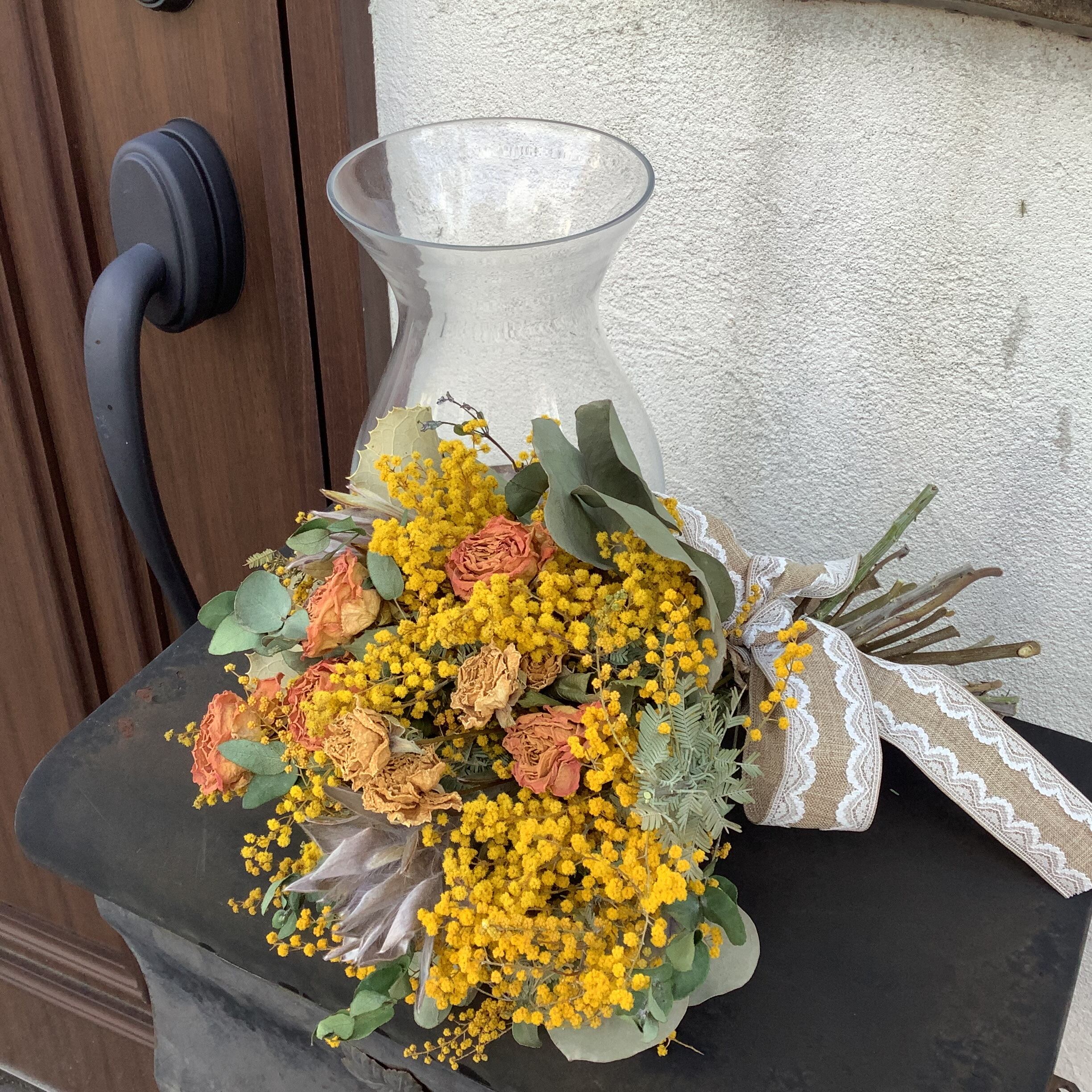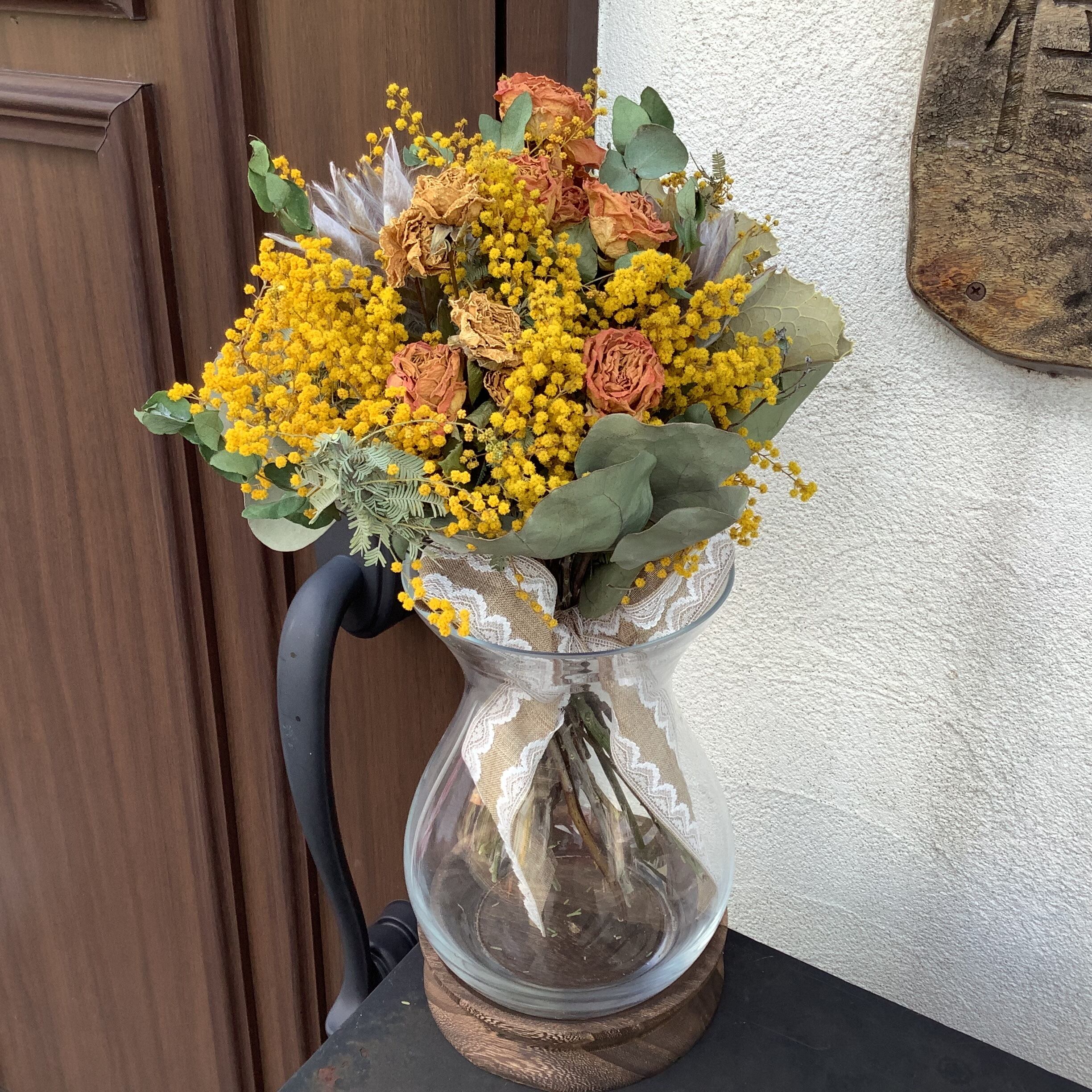 ドライフラワー 前撮り フォトウエディング ミモザイエロー ウッド座のグラス花瓶付き