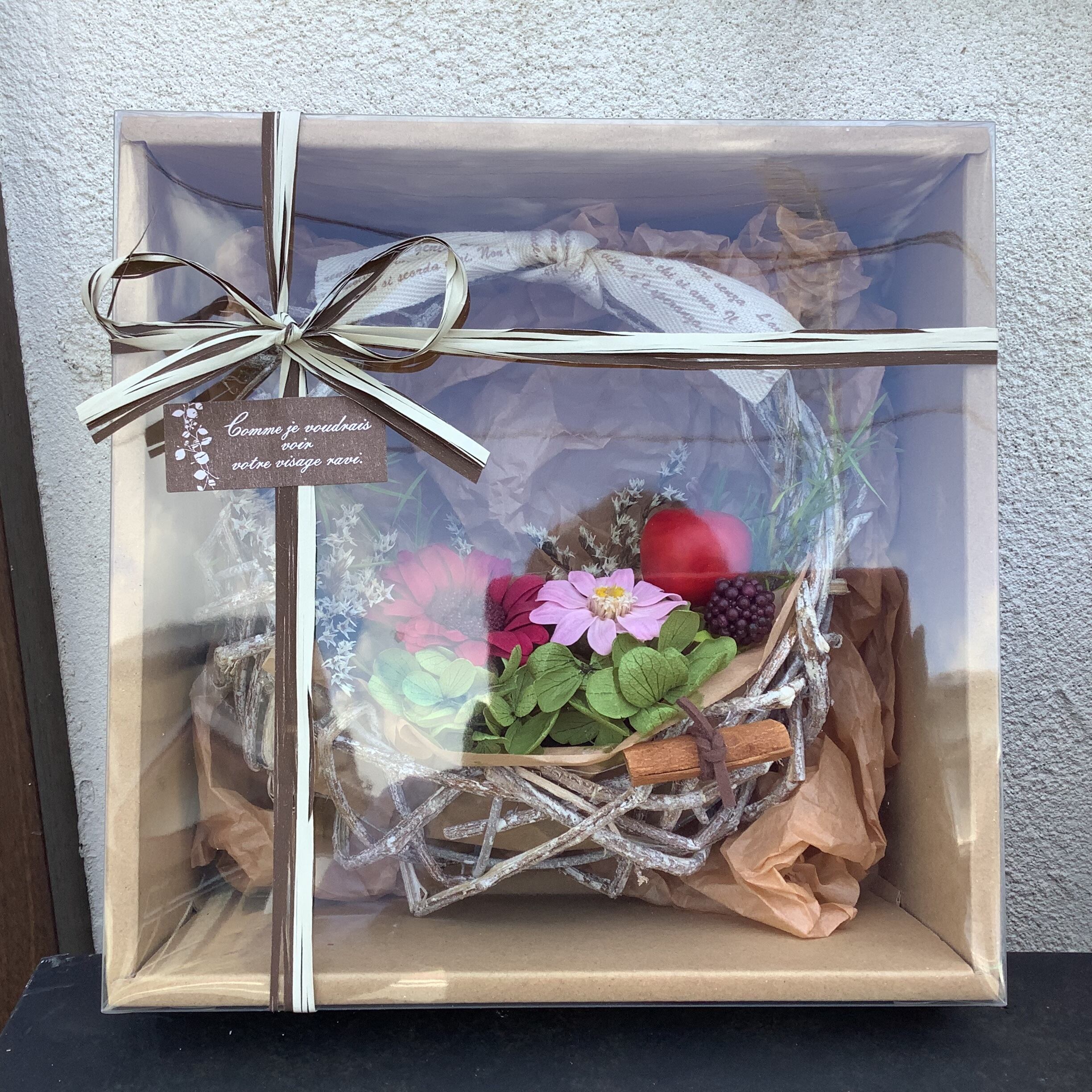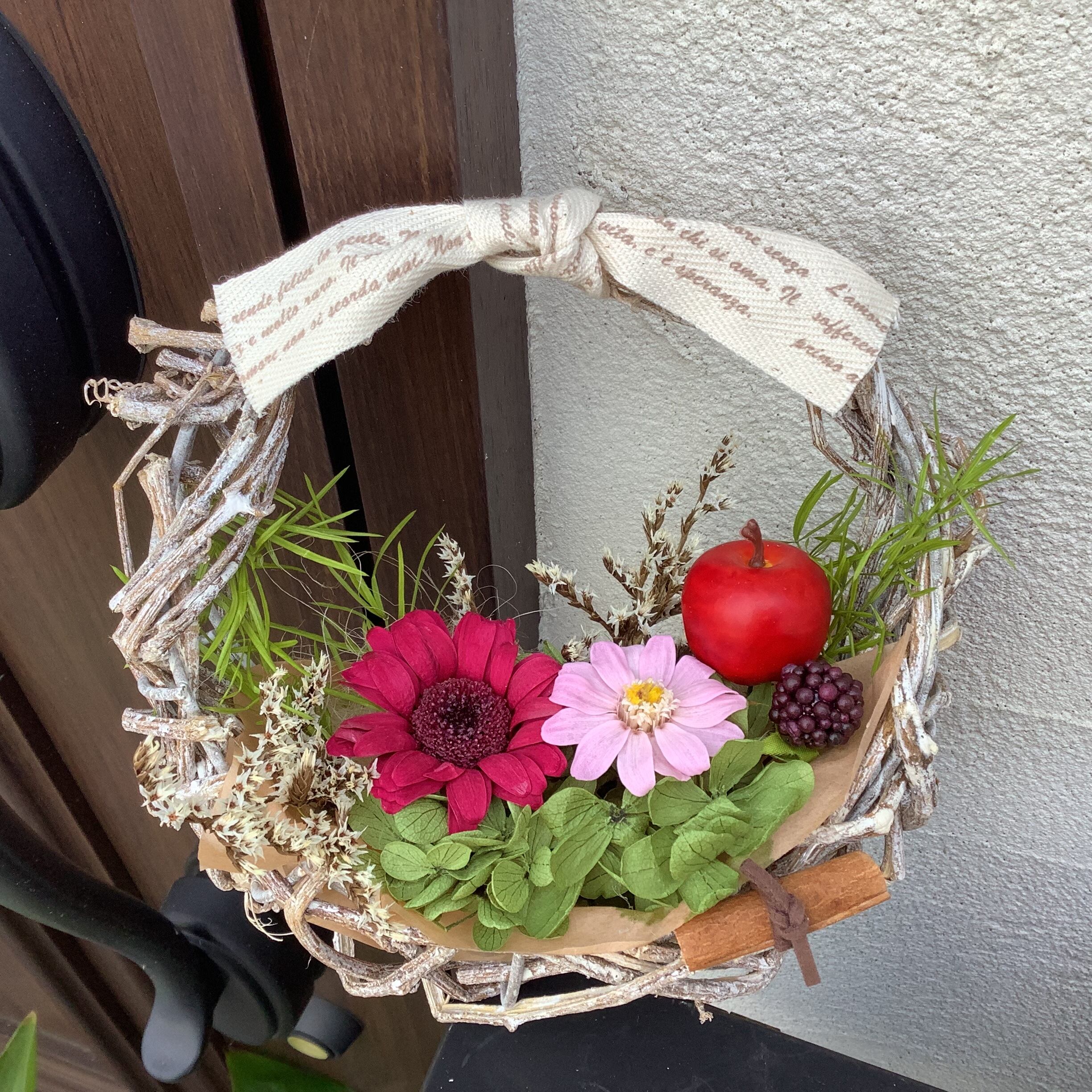 籐カゴにプリザーブドフラワーをアレンジしましたリースでございます。