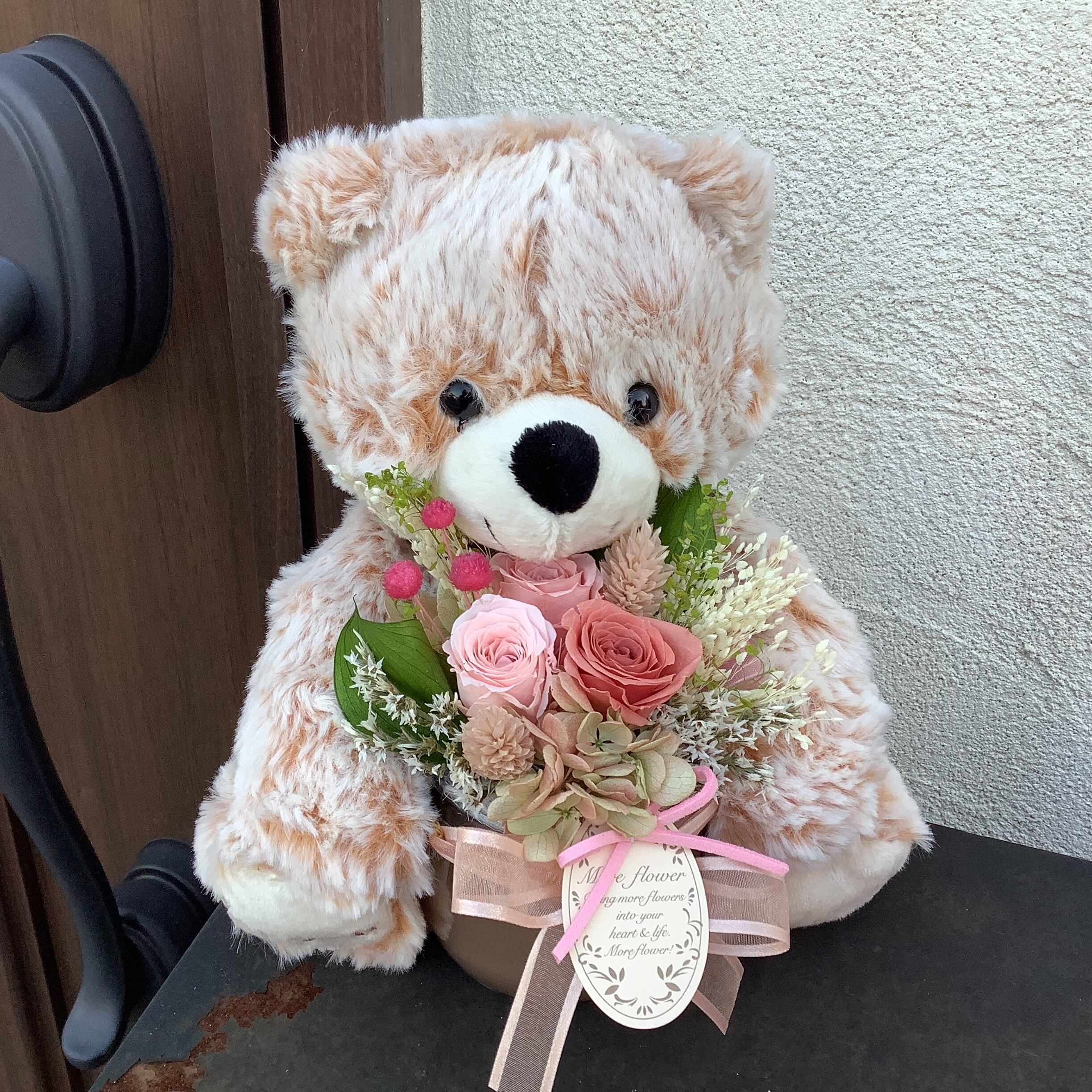 可愛いクマちゃんがお花を抱っこしているプリザーブドフラワーのアレンジメントです。