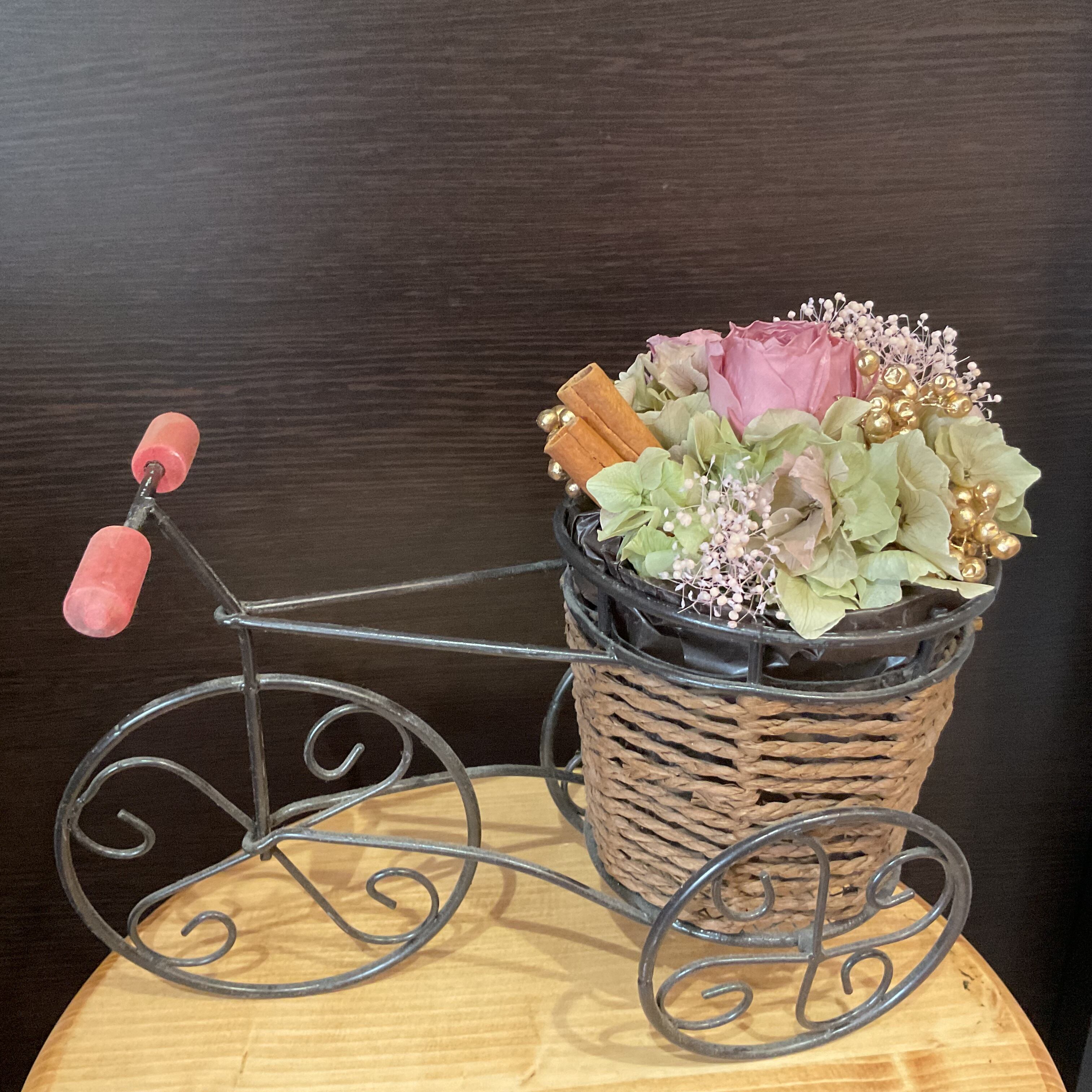 アンティークピンクの自転車アレンジメントが、あなたの空間を優雅に演出し、幸せな気持ちを届けることを願っています。